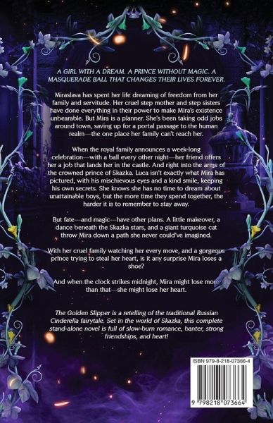 A girl with a dream. A prince without magic. A masquerade ball that changes their lives forever. Miraslava has spent her life dreaming of freedom from her family and servitude. Her cruel step mother and step sisters have done everything in their power to make Mira's existence unbearable. But Mira is a planner. She's been taking odd jobs around town, saving up for a portal passage to the human realm-the one place her family can't reach her. When the royal family announces a week-long celebration-with a ball every other night-her friend offers her a job that lands her in the castle. And right into the arms of the crowned prince of Skazka. Luca isn't exactly what Mira has pictured, with his mischievous eyes and a kind smile, keeping his own secrets. She knows she has no time to dream about unattainable boys, but the more time they spend together, the harder it is to remember to stay away. But fate-and magic-have other plans. A little makeover, a dance beneath the Skazka stars, and a giant turquoise cat throw Mira down a path she never could've imagined. With her cruel family watching her every move, and a gorgeous prince trying to steal her heart, is it any surprise Mira loses a shoe? And when the clock strikes midnight, Mira might lose more than that-she might lose her heart. The Golden Slipper is a retelling of the traditional Russian Cinderella fairytale. Set in the world of Skazka, this complete stand-alone novel is full of slow-burn romance, banter, strong friendships, and heart!