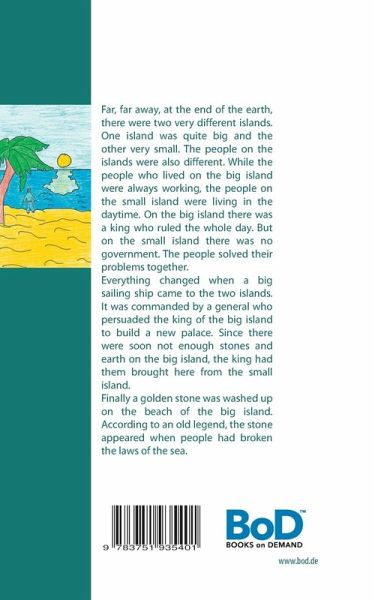 Far, far away, at the end of the earth, there were two very different islands. One island was quite big and the other very small. The people on the islands were also different. While the people who lived on the big island were always working, the people on the small island were living in the daytime. On the big island there was a king who ruled the whole day. But on the small island there was no government. The people solved their problems together.Everything changed when a big sailing ship came to the two islands. It was commanded by a general who persuaded the king of the big island to build a new palace. Since there were soon not enough stones and earth on the big island, the king had them brought here from the small island.Finally a golden stone was washed up on the beach of the big island. According to an old legend, the stone appeared when people had broken the laws of the sea. Soon after, a great storm gathered over the islands...