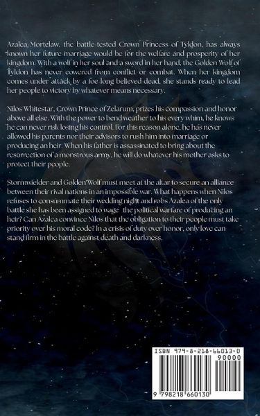 Azalea Mortclaw, the battle-tested Crown Princess of Tyldon, has always known her future marriage would be for the welfare and prosperity of her kingdom. With a wolf in her soul and a sword in her hand, the Golden Wolf of Tyldon has never cowered from conflict or combat. When her kingdom comes under attack by a foe long believed dead, she stands ready to lead her people to victory by whatever means necessary. Nilos Whitestar, Crown Prince of Zelarum, prizes his compassion and honor above all else. With the power to bend weather to his every whim, he knows he can never risk losing his control. For this reason alone, he has never allowed his parents nor their advisors to rush him into marriage or producing an heir. When his father is assassinated to bring about the resurrection of a monstrous army, he will do whatever his mother asks to protect their people. Stormwielder and Golden Wolf must meet at the altar to secure an alliance between their rival nations in an impossible war. What happens when Nilos refuses to consummate their wedding night and robs Azalea of the only battle she has been assigned to wage- the political warfare of producing an heir? Can Azalea convince Nilos that the obligation to their people must take priority over his moral code? In a crisis of duty over honor, only love can stand firm in the battle against death and darkness.
