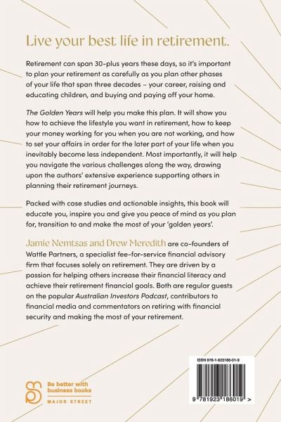 Live your best life in retirement. Retirement can span 30-plus years these days, so it's important to plan your retirement as carefully as you plan other phases of your life that span three decades - your career, raising and educating children, and buying and paying off your home. The Golden Years will help you make this plan. It will show you how to achieve the lifestyle you want in retirement, how to keep your money working for you when you are not working, and how to set your affairs in order for the later part of your life when you inevitably become less independent. Most importantly, it will help you navigate the various challenges along the way, drawing upon the authors' extensive experience supporting others in planning their retirement journeys. Packed with case studies and actionable insights, this book will educate you, inspire you and give you peace of mind as you plan for, transition to and make the most of your 'golden years'.