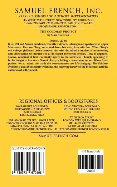 Drama / 2f, 1m It is 1994 and Naomi Goldman, recently widowed, is living in an apartment in upper Manhattan. Her son Tony, separated from his wife, lives with her. When Tony's old college girlfriend Aviva contacts him with the ulterior motive of interviewing and videotaping his mother for a Holocaust memorial project, Tony is appalled. Naomi, reluctant at first, eventually agrees to the interview. Though appearing to be forthright in her story Naomi clearly is hiding a devastating secret. When Aviva pushes her to admit the truth the consequences are life-changing. The Goldman Project is a play about family relations, the lingering legacy of the Holocaust and the catharsis of self-renewal. "Introducing Naomi, a Romanian-born widow, as a lovably comic, more than a little stereotypical character...a smart decision on the part of Staci Swedeen" - Anita Gates, The New York Times "Swedeen has an ear for dialogue, even the passages in Yiddish fit the moment nicely. (Don't worry: The Yiddish is instantly translated in the course of the conversation.)" - Peter D. Kramer, The Journal News "This fine play is less about the past than about living with honesty in the present." - James F.Cotter, Times Herald-Record