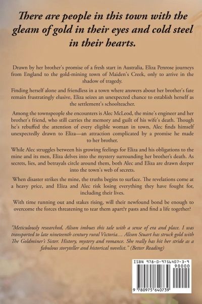'There are people in this town with the gleam of gold in their eyes and cold steel in their hearts.' Drawn by her brother's promise of a fresh start in Australia, Eliza Penrose journeys from England to the gold-mining town of Maiden's Creek, only to arrive in the shadow of tragedy. Finding herself alone and friendless in a town where answers about her brother's fate remain frustratingly elusive, Eliza seizes an unexpected chance to establish herself as the settlement's schoolteacher. Among the townspeople she encounters is Alec McLeod, the mine's engineer and her brother's friend, who still carries the memory and guilt of his wife's death. Though he's rebuffed the attention of every eligible woman in town, Alec finds himself unexpectedly drawn to Eliza-an attraction complicated by a promise he made to her brother. While Alec struggles between his growing feelings for Eliza and his obligations to the mine and its men, Eliza delves into the mystery surrounding her brother's death. As secrets, lies, and betrayals circle around them, both Alec and Eliza are drawn deeper into the town's web of secrets. When disaster strikes the mine, the truths begins to surface. The revelations come at a heavy price, and Eliza and Alec risk losing everything they have fought for, including their lives. With time running out and stakes rising, will their newfound bond be enough to overcome the forces threatening to tear them apart? "Meticulously researched, Alison imbues this tale with a sense of era and place. I was transported to late nineteenth century rural Victoria... Alison Stuart has struck gold with The Goldminer's Sister. History, mystery and romance. She really has hit her stride as a fabulous storyteller and historical novelist." (Better Reading)