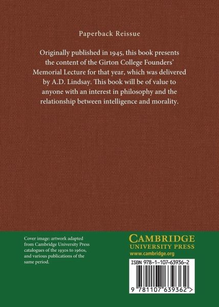 Originally published in 1945, this book presents the content of the Girton College Founders' Memorial Lecture for that year, which was delivered by A. D. Lindsay. This book will be of value to anyone with an interest in philosophy and the relationship between intelligence and morality.