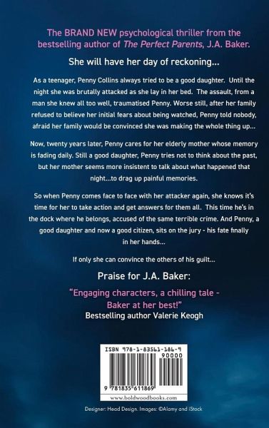 The BRAND NEW psychological thriller from the bestselling author of The Perfect Parents, J A Baker. She will have her day of reckoning... As a teenager, Penny Collins always tried to be a good daughter. Until the night she was brutally attacked as she lay in her bed. The assault, from a man she knew all too well, traumatised Penny. Worse still, after her family refused to believe her initial fears about being watched, Penny told nobody, afraid her family would be convinced she was making the whole thing up... Now, twenty years later, Penny cares for her elderly mother whose memory is fading daily. Still a good daughter, Penny tries not to think about the past, but her mother seems more insistent to talk about what happened that night...to drag up painful memories. So when Penny comes face to face with her attacker again, she knows it's time for her to take action and get answers for them all. This time he's in the dock where he belongs, accused of the same terrible crime. And Penny, a good daughter and now a good citizen, sits on the jury - his fate finally in her hands... If only she can convince the others of his guilt... Praise for J A Baker: ""Engaging characters, a chilling tale - Baker at her best!"" Bestselling author Valerie Keogh ""A dark and twisting thrill ride that asks the question: how well do you really know your parents? It kept me hooked until the final page!"" Bestselling author M.A. Hunter ""A dark and twisty thriller that keep you guessing at the truth, The Perfect Parents is an addictive read!"" Bestselling author Alison Stockham ""This captivating pacy thriller sucks you in from the first page and spits you out at the last! I thought I'd worked it out, but no... the twists kept coming and the final reveal is a heartbreaker