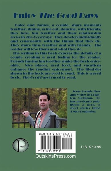 Enjoy The Good Days Kalee and James, a couple, share moments together: dining, going out, dancing, with friends; they have fun together and their relationship grows in The Good Days. They develop individually and congruently with the things that they do. They share time together and with friends. The reader will love them and what they do. The writing in this book exposes the details of a couple creating a good feeling for the reader. Friends having fun together make the book enjoyable. Nice places, good food, and vacations enhance the reading enjoyment. The lifestyles shown in the book are good to read. This is a good book. The Good Days is good to read.