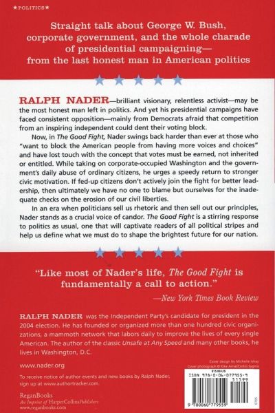 Straight talk about George W. Bush, corporate government, and the whole charade of presidential campaigning -- from the last honest man in American politics Ralph Nader -- brilliant visionary, relentless activist -- may be the most honest man left in politics. And yet his presidential campaigns have faced consistent opposition -- mainly from Democrats afraid that competition from an inspiring independent could dent their voting block. Now, in The Good Fight, Nader swings back harder than ever at those who "want to block the American people from having more voices and choices" and have lost touch with the concept that votes must be earned, not inherited or entitled. While taking on corporate-occupied Washington and the government's daily abuse of ordinary citizens, he urges a speedy return to stronger civic motivation. If fed-up citizens don't actively join the fight for better leadership, then ultimately we have no one to blame but ourselves for the inadequate checks on the erosion of our civil liberties. In an era when politicians sell us rhetoric and then sell out our principles, Nader stands as a crucial voice of candor. The Good Fight is a stirring response to politics as usual, one that will captivate readers of all political stripes and help us define what we must do to shape the brightest future for our nation.