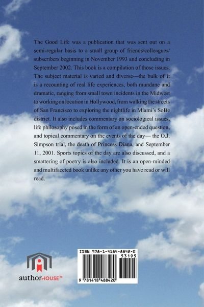 The Good Life was a publication that was sent out on a semi-regular basis to a small group of friends/colleagues/subscribers beginning in November 1993 and concluding in September 2002. This book is a compilation of those issues. The subject material is varied and diverse-the bulk of it is a recounting of real life experiences, both mundane and dramatic, ranging from. small town incidents in the Midwest to working on location in Hollywood, from walking the streets of San Francisco to checking Out the nightlife in Miami