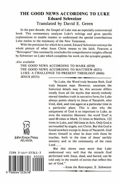 This commentary analyzes Luke's writings and gives specific explanations to enable readers to understand the special contributions Luke makes to the testimony of the New Testament. With the precision for which he is noted, Eduard Schweizer conveys the whole picture of what Jesus Christ means to the faith.