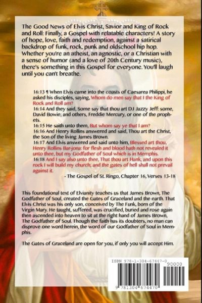 The Good News of Elvis Christ, Savior and King of Rock and Roll. Finally, a Gospel with relatable characters! A story of hope, love, faith and redemption, against a satirical backdrop of funk, rock, punk and oldschool hip hop. Whether you're an atheist, an agnostic, or a Christian with a sense of humor (and a love of 20th Century music), there's something in this Gospel for everyone. You'll laugh until you can't breathe. This foundational text of Elvianity teaches us that James Brown, The Godfather of Soul, created the Gates of Graceland and the earth. That Elvis Christ was his only son, conceived by The Funk, born of the Virgin Mary. He taught, suffered, was crucified, buried and rose again then ascended into heaven to sit at the right hand of James Brown, The Godfather of Soul. Though the faith has its doubters, no man can disprove one word herein, the word of our Godfather of Soul in Memphis. The Gates of Graceland are open for you, if only you will accept Him.