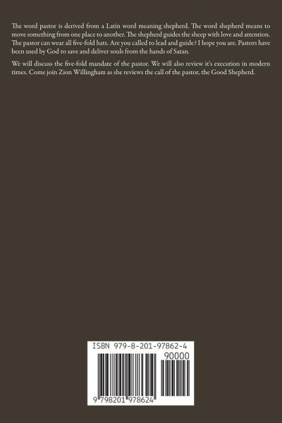 The word pastor is derived from a Latin word meaning shepherd. The word shepherd means to move something from one place to another. The shepherd guides the sheep with love and attention. The pastor can wear all five-fold hats. Are you called to lead and guide? I hope you are. Pastors have been used by God to save and deliver souls from the hands of Satan. We will discuss the five-fold mandate of the pastor. We will also review it's execution in modern times. Come join Zion Willingham as she reviews the call of the pastor, the Good Shepherd.