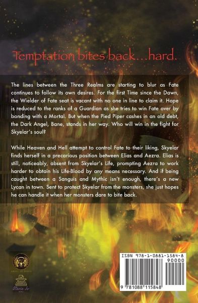 Fourth in the Angel of Death series. The lines between the Three Realms are starting to blur as Fate continues to follow its own desires. For the first Time since the Dawn, the Wielder of Fate seat is vacant with no one in line to claim it. Hope is reduced to the ranks of a Guardian as she tries to win Fate over by bonding with a Mortal. But when the Pied Piper cashes in an old debt, the Dark Angel, Bane, stands in her way. Who will win in the fight for Skyelar's soul? While Heaven and Hell attempt to control Fate to their liking, Skyelar finds herself in a precarious position between Elias and Aezra. Elias is still, noticeably, absent from Skyelar's Life, prompting Aezra to work harder to obtain his Life-Blood by any means necessary. And if being caught between a Sanguis and Mythic isn't enough, there's a new Lycan in town. Sent to protect Skyelar from the monsters, she just hopes he can handle it when her monsters dare to bite back. Because temptation bites back...hard.