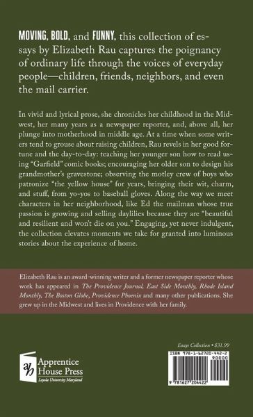 Moving, bold, and funny, this collection of essays by Elizabeth Rau captures the poignancy of ordinary life through the voices of everyday people--children, friends, neighbors, and even the mail carrier. In vivid and lyrical prose, she chronicles her childhood in the Midwest, her many years as a newspaper reporter, and, above all, her plunge into motherhood in middle age. At a time when some writers tend to grouse about raising children, Rau revels in her good fortune and the day-to-day: teaching her younger son how to read using "Garfield" comic books; encouraging her older son to design his grandmother's gravestone; observing the motley crew of boys who patronize "the yellow house" for years, bringing their wit, charm, and stuff, from yo-yos to baseball gloves. Along the way we meet characters in her neighborhood, like Ed the mailman whose true passion is growing and selling daylilies because they are "beautiful and resilient and won't die on you." Engaging, yet never indulgent, the collection elevates moments we take for granted into luminous stories about the experience of home.