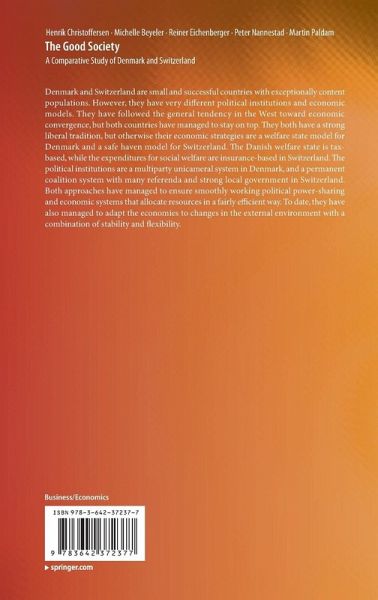 Preface.- 1 Introduction.- Part I: The Quality of Life in Two Different Good Societies: Denmark and Switzerland.- 2 Two Wealthy Economies and Their Development.- 3 Are the Standards of Living Similar or Dissimilar?- 4 Happiness in Denmark and Switzerland.- Part II: Two Models of Good Societies.- 5 Two Stylized Economic Models.- 6 Political Institutions and Politics.- 7 Civil Society.- 8 Two Variants of the Welfare State.- 9 Immigration.- Part III: Challenges for the Two Good Societies.- 10 The Future of the Danish Welfare State.- 11 The Future of the Swiss Welfare State.- 12 Conclusion.