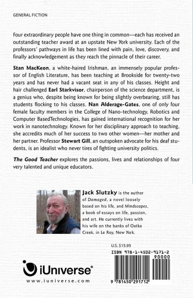 Four extraordinary people have one thing in common-each has received an outstanding teacher award at an upstate New York university. Each of the professors' pathways in life has been lined with pain, love, discovery, and finally acknowledgement as every one reaches the pinnacle of their career. White-haired Irishman Stanley MacKeon, an immensely popular professor of English Literature, has been teaching at Brookside for twenty-two years and has never had a vacant seat in any of his classes. Height- and hair-challenged Earl Starkvisor, chairperson of the science department, is a genius who, despite being known for being slightly overbearing, still has students flocking to his classes. Nan Alderage-Gates, one of only four female faculty members, has gained international recognition for her work in nanotechnology. Known for her disciplinary approach to teaching, she accredits much of her success to two other women-her mother and her partner. Professor Stewart Gill, an outspoken advocate for his deaf students, is an idealist who never tires of fighting university politics. The Good Teacher explores the crux of relationships, foibles, and strengths and weaknesses while sharing the unique stories of the four passionate people behind the awards.
