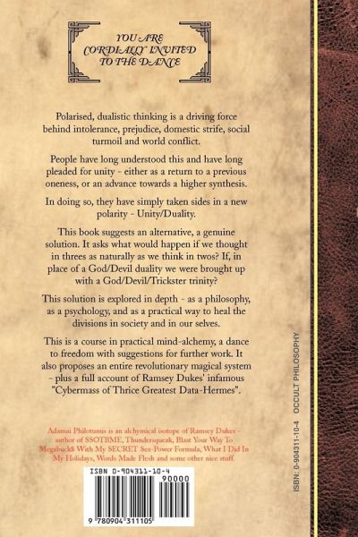 Dualistic thinking presents us with a profound problem. The basic polarity of Good/Bad is the driving force behind most human conflict, where a potentially fertile opposition crystallizes into enmity and the enemy becomes a "demon", totally evil and no longer qualified for human compassion or understanding. This is widely recognised, and the traditional response is a "call to unity" - either in the form of a return to common basics, or an advance towards an higher synthesis. This book presents a different approach. It argues that unity, even in the form of a higher synthesis, is in essence a backward step that sacrifices the potential energy of duality for the peace and stasis of unity. What is really needed is a move forward: from dualistic to trinitarian thinking. This approach is literally a "solution". It is to seek a "third principle", an analog of Mercury or the "Universal Solvent" that transforms a polarised and frozen duality into a flowing and dynamic trinity. Pure conflict becomes transformed into a dance, or game. It is to ask the question "how differently would we see this situation if we had been brought up in a theology of God, Devil and Trickster (The Good The Bad The Funny)?" The idea is explored in depth, as a philosophy, as a psychology, as a practical way to heal the divisions in society and in our selves. The book provides practical suggestions for further work, including an entire revolutionary magical system based on a trinitarian instead of the traditional fourfold model. Previously only circulated in manuscript form to a select circle of friends, this first public edition includes the full account of Ramsey Dukes' infamous "Cybermass of Thrice Greatest Data-Hermes". 285 pages with five chymical plates by Louise Hodson plus over 60 diagrams in text.