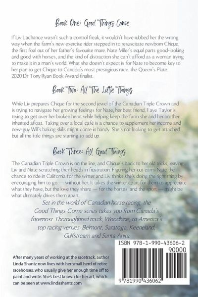 If you love accurate, well-written horse racing fiction, you've found your next favorite series! Set in the world of Canadian horse racing, you'll travel from Canada's foremost track, Woodbine, to America's top racing venues: Belmont, Saratoga, Keeneland, Gulfstream and Santa Anita. Book 1: Good Things Come - 2020 Dr Tony Ryan Award Finalist If Liv Lachance wasn't such a control freak, it wouldn't have rubbed her the wrong way when the farm's new exercise rider stepped in to resuscitate newborn Chique, the first foal out of her father's favourite mare. Nate Miller's equal parts good-looking and good with horses, and the kind of distraction she can't afford as a woman trying to make it in a man's world. What she doesn't expect is for Nate to become key to her plan to get Chique to Canada's most prestigious race: the Queen's Plate. Book 2: All The Little Things While Liv prepares Chique for the second jewel of the Canadian Triple Crown and is trying to navigate her growing feelings for Nate, her best friend, Faye Taylor is trying to get over her broken heart while helping keep the farm she and her brother inherited afloat. Taking over a local café is a chance to supplement her income and new-guy Will's baking skills might come in handy. She's not looking to get attached...but all the little things are starting to add up. Book 3: All Good Things The Canadian Triple Crown is on the line, and Chique's back to her old tricks, leaving Liv and Nate scratching their heads in frustration. Figuring her out earns Nate the chance to ride in California for the winter and Liv thinks she's doing the right thing by encouraging him to go - without her. It takes the winter apart for them to appreciate what they have, but the love they share - for the horses, and the sport - might be what ultimately drives them apart. Reviews for the Good Things Come Series: "Shantz has written a fantastic debut novel set within the behind-the-scenes setting of the (Canadian) racing industry with backdrops of Woodbine and its Queen's Plate, Churchill Downs...and Snowbird destinations like Gulfstream and Payson Park." - Canadian Horse Racing Hall of Fame. "Mixing together hope, heartbreak and romance, a dash of rivalry, and a great deal of excitement, Good Things Come delivers all the goods in terms of top-notch racing fiction. Set in the world of Canadian racing, the story is that of an intense young woman, a troubled young man, and the quirky but talented filly they both love. This is the first book written by an accomplished equine artist and former backside worker who knows her subject well and tells it with a master's hand." - Dr. Tony Ryan Book Award for excellence in Thoroughbred racing literature, finalist 2020. "Good Things Come...delivers sure-footed racing realities, a deliciously slow-burn relationship, and a jock for the ages-all in vivid, evocative prose that belies the book's debut status." - Diana Hurlburt, Readers Up "I'm so happy to have found an author whose knowledge of the world of horse racing is equaled by her ability to craft a really engaging story. What a gift!!" "Characters are unlike any others I've read about in equestrian fiction before." "This series is not just good - but GREAT."