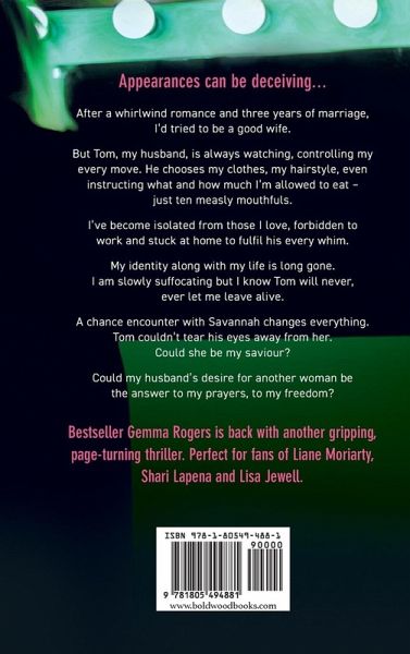 Appearances can be deceiving... After a whirlwind romance and three years of marriage, I'd tried to be a good wife. But Tom, my husband, is always watching, controlling my every move. He chooses my clothes, my hairstyle, even instructing what and how much I'm allowed to eat - just ten measly mouthfuls. I've become isolated from those I love, forbidden to work and stuck at home to fulfil his every whim. My identity along with my life is long gone. I am slowly suffocating but I know Tom will never, ever let me leave alive. A chance encounter with Savannah changes everything. Tom couldn't tear his eyes away from her. Could she be my saviour? Could my husband's desire for another woman be the answer to my prayers, to my freedom? Bestseller Gemma Rogers is back with another gripping, page-turning thriller. Perfect for fans of Liane Moriarty, Shari Lapena and Lisa Jewell . Praise for Gemma Rogers 'Unputdownable. a nail-biting thriller that grips to the very last page' - Keri Beevis 'A claustrophobic psychological thriller with an explosive finale. Gripping and absorbing'- David Beckler 'It's a shocking thriller that grabs at your emotions on every page! Loved it' - Lauren North 'Captivating and enthralling, I give this book five shiny golden stars' - Anita Waller 'A well-written and thoroughly entertaining thriller from a very talented author' - John Nicoll 'A beautifully written edge-of-your-seat thriller that had me guessing right until the end' - Dreda Say Mitchell 'A brilliant thriller from an exciting new voice. Stalker it had me on the edge of my seat' - Kerry Barnes 'An atmospheric, taut thriller which keeps you hooked from the first page' - Jacqui Rose