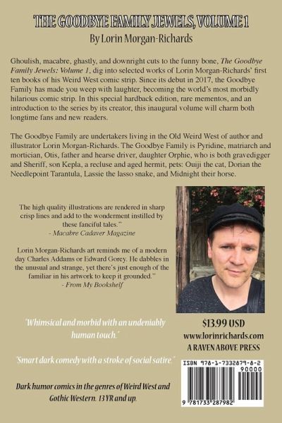 Ghoulish, macabre, ghastly, and downright cuts to the funny bone, The Goodbye Family Jewels: Volume 1, digs into selected works of Lorin Morgan-Richards' first ten books of his Weird West comic strip. Since its debut in 2017, the Goodbye Family has made you weep with laughter, becoming the world's most morbidly hilarious comic strip. In this special edition, rare mementos, and an introduction to the series by its creator, this inaugural volume will charm both longtime fans and new readers. The Goodbye Family are undertakers living in the Old Weird West of author and illustrator Lorin Morgan-Richards. The Goodbye Family is Pyridine, matriarch and mortician, Otis, father and hearse driver, daughter Orphie, who is both gravedigger and Sheriff, son Kepla, a recluse and aged hermit, pets: Ouiji the cat, Dorian the Needlepoint Tarantula, Lassie the lasso snake, and Midnight their horse.