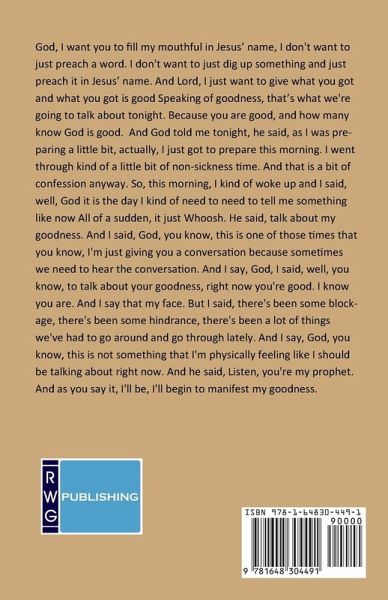 God, I want you to fill my mouthful in Jesus' name, I don't want to just preach a word. I don't want to just dig up something and just preach it in Jesus' name. And Lord, I just want to give what you got and what you got is good Speaking of goodness, that's what we're going to talk about tonight. Because you are good, and how many know God is good. And God told me tonight, he said, as I was preparing a little bit, actually, I just got to prepare this morning. I went through kind of a little bit of non-sickness time. And that is a bit of confession anyway. So, this morning, I kind of woke up and I said, well, God it is the day I kind of need to need to tell me something like now All of a sudden, it just Whoosh. He said, talk about my goodness. And I said, God, you know, this is one of those times that you know, I'm just giving you a conversation because sometimes we need to hear the conversation. And I say, God, I said, well, you know, to talk about your goodness, right now you're good. I know you are. And I say that my face. But I said, there's been some blockage, there's been some hindrance, there's been a lot of things we've had to go around and go through lately. And I say, God, you know, this is not something that I'm physically feeling like I should be talking about right now. And he said, Listen, you're my prophet. And as you say it, I'll be, I'll begin to manifest my goodness. He said, remember when the revival began, and man, I love when we get into a conversation. How many loves to be in a conversation with Jehovah, God, King of glory. And we got in a conversation, and he came back. He said, remember at the beginning of the revival, you kept talking about the breakthrough.