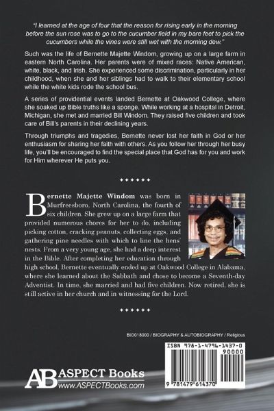 "I learned at the age of four that the reason for rising early in the morning before the sun rose was to go to the cucumber field in my bare feet to pick the cucumbers while the vines were still wet with the morning dew." Such was the life of Bernette Majette Windom, growing up on a large farm in eastern North Carolina. Her parents were of mixed races: Native American, white, black, and Irish. She experienced some discrimination, particularly in her childhood, when she and her siblings had to walk to their elementary school while the white kids rode the school bus. A series of providential events landed Bernette at Oakwood College, where she soaked up Bible truths like a sponge. While working at a hospital in Detroit, Michigan, she met and married Bill Windom. They raised five children and took care of Bill's parents in their declining years. Through triumphs and tragedies, Bernette never lost her faith in God or her enthusiasm for sharing her faith with others. As you follow her through her busy life, you'll be encouraged to find the special place that God has for you and work for Him wherever He puts you.