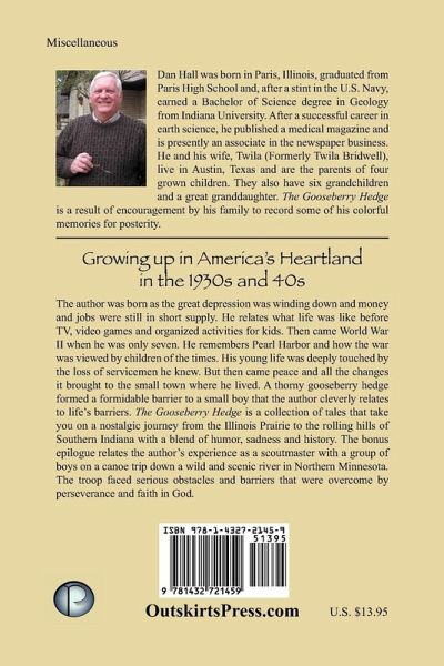 Growing up in America's Heartland in the 1930s and 40s The author was born as the great depression was winding down and money and jobs were still in short supply. He relates what life was like before TV, video games and organized activities for kids. Then came World War II when he was only seven. He remembers Pearl Harbor and how the war was viewed by children of the times. His young life was deeply touched by the loss of servicemen he knew. But then came peace and all the changes it brought to the small town where he lived. A thorny gooseberry hedge formed a formidable barrier to a small boy that the author cleverly relates to life's barriers. The Gooseberry Hedge is a collection of tales that take you on a nostalgic journey from the Illinois Prairie to the rolling hills of Southern Indiana with a blend of humor, sadness and history. The bonus epilogue relates the author's experience as a scoutmaster with a group of boys on a canoe trip down a wild and scenic river in Northern Minnesota. The troop faced serious obstacles and barriers that were overcome by perseverance and faith in God.