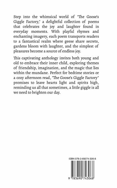 Step into the whimsical world of "The Goose's Giggle Factory," a delightful collection of poems that celebrates the joy and laughter found in everyday moments. With playful rhymes and enchanting imagery, each poem transports readers to a fantastical realm where geese share secrets, gardens bloom with laughter, and the simplest of pleasures become a source of endless joy. This captivating anthology invites both young and old to embrace their inner child, exploring themes of friendship, imagination, and the magic that lies within the mundane. Perfect for bedtime stories or a cozy afternoon read, "The Goose's Giggle Factory" promises to leave hearts light and spirits high, reminding us all that sometimes, a little giggle is all we need to brighten our day.