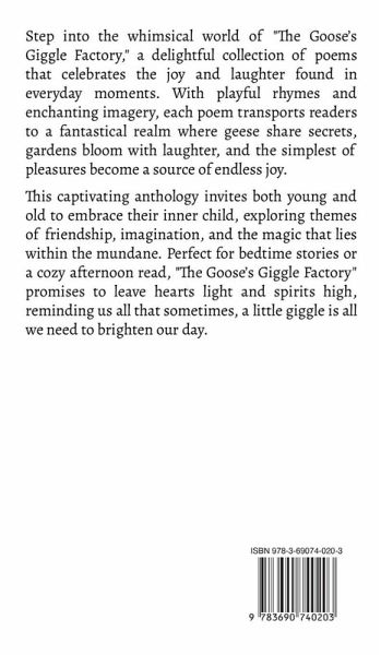 Step into the whimsical world of "The Goose's Giggle Factory," a delightful collection of poems that celebrates the joy and laughter found in everyday moments. With playful rhymes and enchanting imagery, each poem transports readers to a fantastical realm where geese share secrets, gardens bloom with laughter, and the simplest of pleasures become a source of endless joy. This captivating anthology invites both young and old to embrace their inner child, exploring themes of friendship, imagination, and the magic that lies within the mundane. Perfect for bedtime stories or a cozy afternoon read, "The Goose's Giggle Factory" promises to leave hearts light and spirits high, reminding us all that sometimes, a little giggle is all we need to brighten our day.