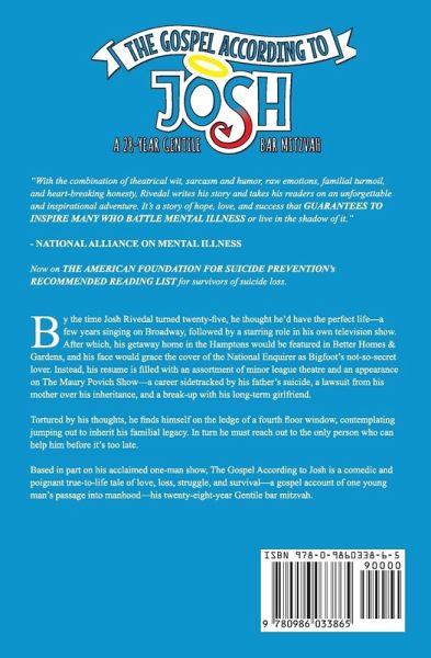 By the time Josh Rivedal turned twenty-five, he thought he'd have the perfect life-a few years singing on Broadway, followed by a starring role in his own television show. After which, his getaway home in the Hamptons would be featured in Better Homes & Gardens, and his face would grace the cover of the National Enquirer as Bigfoot's not-so-secret lover. Instead, his resume is filled with an assortment of minor league theatre and an appearance on The Maury Povich Show-a career sidetracked by his father's suicide, a lawsuit from his mother over his inheritance, and a break-up with his long-term girlfriend. Tortured by his thoughts, he finds himself on the ledge of a fourth floor window, contemplating jumping out to inherit his familial legacy. In turn he must reach out to the only person who can help him before it's too late. Based in part on his acclaimed one-man show, The Gospel According to Josh is a comedic and poignant true-to-life tale of love, loss, struggle, and survival-a gospel account of one young man's passage into manhood-his twenty-eight-year Gentile bar mitzvah. This is the Conscious Ageing Trust edition, with a foreword by Dr. Max Mackay-James. Twenty-five percent of proceeds from this book will be donated to Conscious Ageing Trust and their subsidiaries, Diealog and Men Beyond 50. Conscious Ageing Trust is a "Get People Talking" charity employing strategies to break the taboo surrounding ageing, death and dying, to bring about positive change in people's lives, their communities and society. www.consciousageing.org