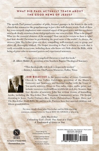Explore what the apostle Paul actually taught about the Good News of Jesus, one verse at a time, so you can better understand the Gospel and your faith. The apostle Paul penned a number of very concise, focused passages in his letters to the early church that summarize the gospel message in just a few well-chosen words. Each of these key texts has a unique emphasis highlighting some essential aspect of the Good News of Jesus Christ. In The Gospel According to Paul, renowned Bible teacher John MacArthur guides you through a close examination of those vital gospel texts, one verse at a time. MacArthur will help you think through challenging questions like: * What is the gospel? * What are the essential elements of the message? * How can we be certain we have it right? * And how should Christians be proclaiming the Good News to the world? Whether you are a layperson who knows very little about the Bible or a seasoned pastor, The Gospel According to Paul will give you a clear, compelling, well-reasoned, easy-to-grasp, and above all, thoroughly biblical exploration of Paul's teachings on the Gospel.