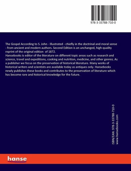 The Gospel According to S. John - Illustrated - chiefly in the doctrinal and moral sense - from ancient and modern authors. Second Edition is an unchanged, high-quality reprint of the original edition of 1872.Hansebooks is editor of the literature on different topic areas such as research and science, travel and expeditions, cooking and nutrition, medicine, and other genres. As a publisher we focus on the preservation of historical literature. Many works of historical writers and scientists are available today as antiques only. Hansebooks newly publishes these books and contributes to the preservation of literature which has become rare and historical knowledge for the future.