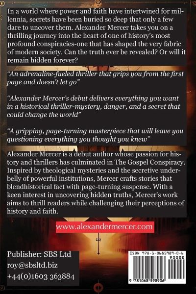 The Gospel Conspiracy by Alexander Mercer Uncover a hidden truth that could change the foundations of Christianity forever. In this thrilling tale, The Gospel Conspiracy, Alexander Mercer takes readers on a dangerous journey into the heart of the Vatican's deepest secrets. Dr. Eleanor Marlowe, a determined scholar of religious history, stumbles upon an ancient manuscript buried beneath the layers of Vatican secrecy-an artefact that was never meant to see the light of day. Its words reveal a hidden gospel, an explosive account that threatens to undermine the Church's official history. With the reluctant yet resourceful Father Benedetti by her side, Eleanor races through shadowy corridors, escapes through secret passageways, and unravels centuries-old codes, all while evading the relentless pursuit of the Vatican's powerful and dangerous Guardians. From the labyrinthine catacombs beneath Florence to the cryptic records buried in the darkest corners of the Vatican Archives, Eleanor must risk everything to bring the truth to light. What she discovers-a gospel written by an apostle deliberately erased from history-holds the power to reshape the beliefs of millions. Fans of Dan Brown and historical thrillers will be captivated by Mercer's deft blend of suspense, conspiracy, and historical intrigue. The Gospel Conspiracy is a story of courage, faith, and the timeless struggle for truth, pitting one woman against an institution that will stop at nothing to protect its secrets.