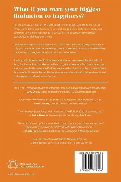 What if you were your biggest limitation to happiness? For the Enneagram Seven-the Enthusiast-it's all about living life to the fullest. While our negative and overly serious world desperately needs your energy and optimism, sometimes your fast pace causes you to become overextended, scattered, and dismissed by others. Certified Enneagram Coach and pastor, Tyler Zach, offers this 40-day devotional to help you hear from God and encourage you as you make the world a more exciting place with your imagination, spontaneity, and enthusiasm. Inside, you'll discover how to overcome your fear of pain, enjoy pleasure without living for it, establish boundaries that lead to greater freedom, find contentment with less, and gain lasting peace in God's presence rather than through your future plans. Be prepared to encounter the God of abundance, who doesn't want you to miss out on the wonderful plans He has for you.