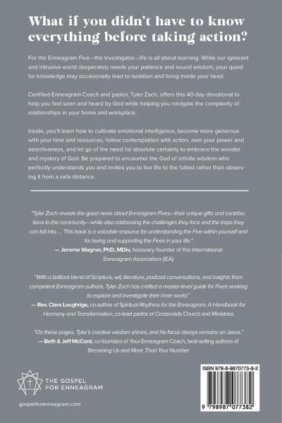 What if you didn't have to know everything before taking action? For the Enneagram Five-the Investigator-life is all about learning. While our ignorant and intrusive world desperately needs your patience and sound wisdom, your quest for knowledge may occasionally lead to isolation and living inside your head. Certified Enneagram Coach and pastor, Tyler Zach, offers this 40-day devotional to help you feel seen and heard by God while helping you navigate the complexity of relationships in your home and workplace. Inside, you'll learn how to cultivate emotional intelligence, become more generous with your time and resources, follow contemplation with action, own your power and assertiveness, and let go of the need for absolute certainty to embrace the wonder and mystery of God. Be prepared to encounter the God of infinite wisdom who perfectly understands you and invites you to live life to the fullest rather than observing it from a safe distance.