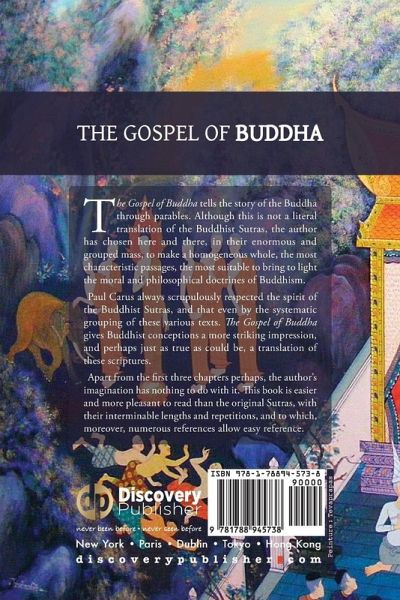 The Gospel of Buddha tells the story of the Buddha through parables. Although this is not a literal translation of the Buddhist Sutras, the author has chosen here and there, in their enormous and grouped mass, to make a homogeneous whole, the most characteristic passages, the most suitable to bring to light the moral and philosophical doctrines of Buddhism. Paul Carus always scrupulously respected the spirit of the Buddhist Sutras, and that even by the systematic grouping of these various texts. The Gospel of Buddha gives Buddhist conceptions a more striking impression, and perhaps just as true as could be, a translation of these scriptures. Apart from the first three chapters perhaps, the author's imagination has nothing to do with it. This book is easier and more pleasant to read than the original Sutras, with their interminable lengths and repetitions, and to which, moreover, numerous references allow easy reference. Publisher's note for the printed edition: in order to be more enjoyable during reading, this book is in 6" x 9" format. In the same spirit, the paper is cream-colored, which causes less fatigue to the eyes than white paper. All our publications are carefully crafted, both in terms of typography as well as design. Publisher's note for the Kindle edition: our Kindle publications are carefully crafted, with Table of Contents, Index, Footnotes and References when applicable. A strong emphasis has been put on the typography as well as the design. Your comments are welcome at discoverypublisher.com - Thank you for choosing Discovery Publisher.