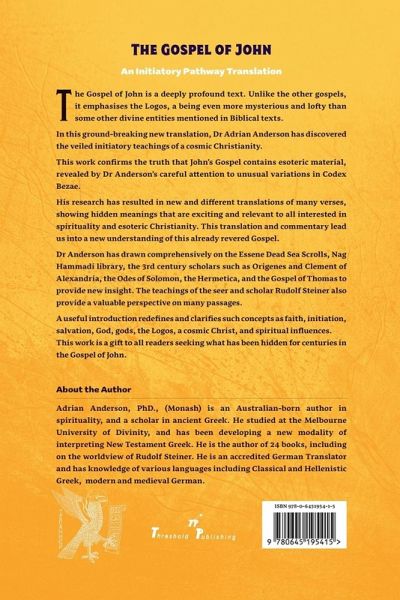 The Gospel of John is a deeply profound text. Unlike the other gospels, it emphasises the Logos, a being even more mysterious and lofty than some other divine entities mentioned in Biblical texts. In this ground-breaking new translation, Dr Adrian Anderson has discovered the veiled initiatory teachings of a cosmic Christianity. This work confirms the truth that John's Gospel contains esoteric material, revealed by Dr Anderson's careful attention to unusual variations in Codex Bezae. His research has resulted in new and different translations of many verses, showing hidden meanings that are exciting and relevant to all interested in spirituality and esoteric Christianity. This translation and commentary lead us into a new understanding of this already revered Gospel. Dr Anderson has drawn comprehensively on the Essene Dead Sea Scrolls, Nag Hammadi library, the 3rd century scholars such as Origenes and Clement of Alexandria, the Odes of Solomon, the Hermetica, and the Gospel of Thomas to provide new insight. The teachings of the seer and scholar Rudolf Steiner also provide a valuable perspective on many passages. A useful introduction redefines and clarifies such concepts as faith, initiation, salvation, God, gods, the Logos, a cosmic Christ, and spiritual influences. This work is a gift to all readers seeking what has been hidden for centuries in the Gospel of John.