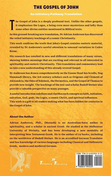 The Gospel of John is a deeply profound text. Unlike the other gospels, it emphasises the Logos, a being even more mysterious and lofty than some other divine entities mentioned in Biblical texts. In this ground-breaking new translation, Dr Adrian Anderson has discovered the veiled initiatory teachings of a cosmic Christianity. This work confirms the truth that John's Gospel contains esoteric material, revealed by Dr Anderson's careful attention to unusual variations in Codex Bezae. His research has resulted in new and different translations of many verses, showing hidden meanings that are exciting and relevant to all interested in spirituality and esoteric Christianity. This translation and commentary lead us into a new understanding of this already revered Gospel. Dr Anderson has drawn comprehensively on the Essene Dead Sea Scrolls, Nag Hammadi library, the 3rd century scholars such as Origenes and Clement of Alexandria, the Odes of Solomon, the Hermetica, and the Gospel of Thomas to provide new insight. The teachings of the seer and scholar Rudolf Steiner also provide a valuable perspective on many passages. A useful introduction redefines and clarifies such concepts as faith, initiation, salvation, God, gods, the Logos, a cosmic Christ, and spiritual influences. This work is a gift to all readers seeking what has been hidden for centuries in the Gospel of John.