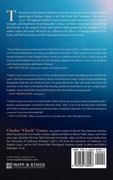 This book is a devotional translation from the Greek text of the Gospel of John appearing in Barbara Aland et al.'s The Greek New Testament (5th rev. ed., 2014). Throughout Charles Comey's journey with cancer, he found comfort, strength, and inspiration from being able to return to John's Gospel each day and read devotionally in the original Greek and Hebrew while preparing this translation. The author hopes this book will serve as a reference for fellow Christians, seekers of the truth, and fellow travelers on life's long and sometimes lonely road.
