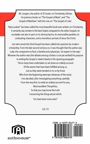 Mr. Jungers, the author of 25 books on Christianity, follows his previous books on "The Gospel of Mark", and "The Gospel of Matthew" with this one on "The Gospel of Luke'. "Kata Loukan" has been called the most beautiful book ever written on Christianity. It certainly was written in the best Greek compared to the other Gospels. Its accolades rest also in part on its stirring hymns, its memorable parables, its contrasting characters, and a marvelous portrait of Jesus the Christ. Just who wrote this third Gospel has been called into question by modern scholarship. From the late second century on, it was thought that the author was Luke, the companion to Paul, a Gentile and a physician, "an expert in the way". Whoever the author was (the debate among scholars is not yet settled) his purpose in writing the Gospel is stated clearly in the opening paragraph: "Since many have undertaken to set down an orderly account Of the events that have been fulfilled among us, Just as they were handed on to us by those Who from the beginning were eye-witnesses of the word, I too decided, after investigating everything carefully From the very first, to write an orderly account for you, Most excellent Theophilus, So that you may know the truth Concerning the things about which You have been instructed." (Lk 1:1)