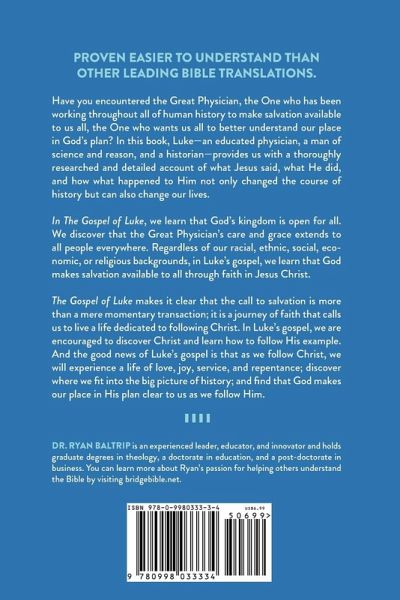 Have you encountered the Great Physician, the One who has been working throughout all of human history to make salvation available to us all, the One who wants us all to better understand our place in God's plan? In this book, Luke-an educated physician, a man of science and reason, and a historian-provides us with a thoroughly researched and detailed account of what Jesus said, what He did, and how what happened to Him not only changed the course of history but can also change our lives. In The Gospel of Luke, we learn that God's kingdom is open for all. We discover that the Great Physician's care and grace extends to all people everywhere. Regardless of our racial, ethnic, social, economic, or religious backgrounds, in Luke's gospel, we learn that God makes salvation available to all through faith in Jesus Christ. The Gospel of Luke makes it clear that the call to salvation is more than a mere momentary transaction; it is a journey of faith that calls us to live a life dedicated to following Christ. In Luke's gospel, we are encouraged to discover Christ and learn how to follow His example. And the good news of Luke's gospel is that as we follow Christ, we will experience a life of love, joy, service, and repentance; discover where we fit into the big picture of history; and find that God makes our place in His plan clear to us as we follow Him.