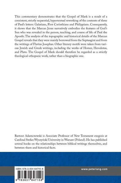 This commentary demonstrates that the Gospel of Mark is a result of a consistent, strictly sequential, hypertextual reworking of the contents of three of Paul's letters: Galatians, First Corinthians and Philippians. Consequently, it shows that the Marcan Jesus narratively embodies the features of God's Son who was revealed in the person, teaching, and course of life of Paul the Apostle. The analysis of the topographic and historical details of the Marcan Gospel reveals that they were mainly borrowed from the Septuagint and from the writings of Flavius Josephus. Other literary motifs were taken from various Jewish and Greek writings, including the works of Homer, Herodotus, and Plato. The Gospel of Mark should therefore be regarded as a strictly theological-ethopoeic work, rather than a biographic one.