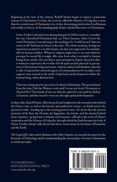 Beginning at the turn of the century, Rudolf Steiner began to express a passionate interest in Christianity. For him, the event he called the "Mystery of Golgotha" is more than the central event of Christianity; it is, in fact, the turning point in time for all human and earthly evolution. In his Autobiography, Steiner clarified his views on Christianity: "Some of what I said and wrote during that period [1890s] seems to contradict the way I described Christianity later on. This is because, when I wrote the word Christianity, I was referring to the teachings of a "world beyond" that was active in all Christian doctrines at the time. The whole meaning of religious experiences pointed to a world of spirit, one that was supposed to be unattainable by human intellect. Whatever religion might have to say and whatever precepts for moral life it might offer arise from what is revealed to human beings from outside. My own direct, inner perception of spirit objected to this; it wanted to experience the worlds of both spirit and the physical in perceptions of the human being and nature. And my ethical individualism objected to this. It rejected the external support of commandments for morality; such support came instead as the result of spiritual soul development within the human being, where divinity lives. That was a trying time for my soul as I looked at Christianity. This period lasted from the time I left the Weimar work until I wrote my book Christianity as Mystical Fact. These kinds of tests are obstacles, placed in one's path by destiny (or karma), and they must be overcome through spiritual development. In these talks, Rudolf Steiner offers his profound insights into the essential truths behind the Christ event, as well as the historic and prehistoric events-on Earth and in the spiritual worlds-leading up to the turning point in time. He shows that the ancient mysteries of the East, the Persians, the Egyptians, the Greeks, and the streams behind those impulses-going back to Atlantis and Lemuria-all lead to the event of Christ's incarnation and the Mystery of Golgotha, through which the Earth became the body of Christ. Further, Steiner talks about what those events mean for the future of humanity and the Earth." The Gospel of St. John and Its Relation to the Other Gospels is an essential document in the literature of Christology and for understanding the central place of esoteric Christianity in Anthroposophy.