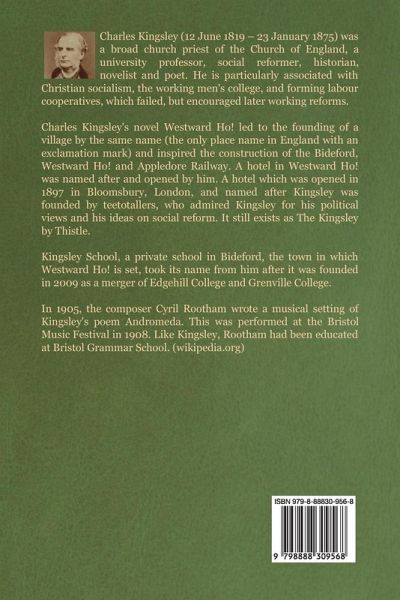 About the author: Charles Kingsley (12 June 1819 - 23 January 1875) was a broad church priest of the Church of England, a university professor, social reformer, historian, novelist and poet. He is particularly associated with Christian socialism, the working men's college, and forming labour cooperatives, which failed, but encouraged later working reforms. Charles Kingsley's novel Westward Ho! led to the founding of a village by the same name (the only place name in England with an exclamation mark) and inspired the construction of the Bideford, Westward Ho! and Appledore Railway. A hotel in Westward Ho! was named after and opened by him. A hotel which was opened in 1897 in Bloomsbury, London, and named after Kingsley was founded by teetotallers, who admired Kingsley for his political views and his ideas on social reform. It still exists as The Kingsley by Thistle. Kingsley School, a private school in Bideford, the town in which Westward Ho! is set, took its name from him after it was founded in 2009 as a merger of Edgehill College and Grenville College. In 1905, the composer Cyril Rootham wrote a musical setting of Kingsley's poem Andromeda. This was performed at the Bristol Music Festival in 1908. Like Kingsley, Rootham had been educated at Bristol Grammar School. (wikipedia.org)