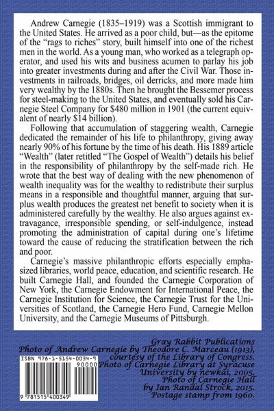 Andrew Carnegie (1835-1919) was a Scottish immigrant to the United States. He arrived as a poor child, but?as the epitome of the "rags to riches" story, built himself into one of the richest men in the world. As a young man, who worked as a telegraph operator, and used his wits and business acumen to parlay his job into greater investments during and after the Civil War. Those investments in railroads, bridges, oil derricks, and more made him very wealthy by the 1880s. Then he brought the Bessemer process for steel-making to the United States, and eventually sold his Carnegie Steel Company for $480 million in 1901 (the current equivalent of nearly $14 billion). Following that accumulation of staggering wealth, Carnegie dedicated the remainder of his life to philanthropy, giving away nearly 90 percent of his fortune by the time of his death. His 1889 article "Wealth" (later retitled "The Gospel of Wealth") details his belief in the responsibility of philanthropy by the self-made rich. He wrote that the best way of dealing with the new phenomenon of wealth inequality was for the wealthy to redistribute their surplus means in a responsible and thoughtful manner, arguing that surplus wealth produces the greatest net benefit to society when it is administered carefully by the wealthy. He also argues against extravagance, irresponsible spending, or self-indulgence, instead promoting the administration of capital during one's lifetime toward the cause of reducing the stratification between the rich and poor. Carnegie's massive philanthropic efforts especially emphasized libraries, world peace, education, and scientific research. He built Carnegie Hall, and founded the Carnegie Corporation of New York, the Carnegie Endowment for International Peace, the Carnegie Institution for Science, the Carnegie Trust for the Universities of Scotland, the Carnegie Hero Fund, Carnegie Mellon University, and the Carnegie Museums of Pittsburgh.
