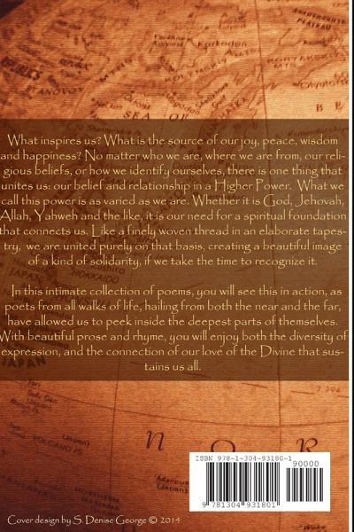 What inspires us? What is the source of our joy, peace, wisdom and happiness? No matter who we are, where we are from, our religious beliefs, or how we identify ourselves, there is one thing that unites us: our belief and relationship in a Higher Power. What we call this power is as varied as we are. Whether it is God, Jehovah, Allah, Yahweh and the like, it is our need for a spiritual foundation that connects us. Like a finely woven thread in an elaborate tapestry, we are united purely on that basis, creating a beautiful image of a kind of solidarity, if we take the time to recognize it. In this intimate collection of poems, you will see this in action, as poets from all walks of life, hailing from both the near and the far, have allowed us to peek inside the deepest parts of themselves. With beautiful prose and rhyme, you will enjoy both the diversity of expression, and the connection of our love of the Divine that sustains us all.