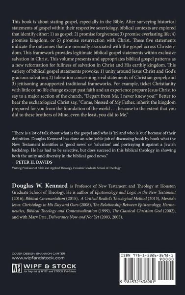 This book is about stating gospel, especially in the Bible. After surveying historical statements of gospel within their respective soteriology, biblical contexts are explored that identify either: 1) as gospel; 2) promise forgiveness; 3) promise everlasting life; 4) promise kingdom; or 5) promise resurrection with Christ. These five statements indicate the outcomes that are normally associated with the gospel across Christendom. This framework provides legitimate biblical gospel statements within exclusive salvation in Christ. This volume presents and appropriates biblical gospel patterns as a new reformation for fullness of salvation in Christ and His earthly kingdom. This variety of biblical gospel statements provoke: 1) unity around Jesus Christ and God's gracious salvation; 2) toleration concerning rival statements of Christian gospel; and 3) jettisoning unsupported traditional frameworks. For example, ticket Christianity with little or no life change except past faith and an experience prepare Jesus Christ to say to a major section of the church, ""Depart from Me, I never knew you!"" Better to hear the eschatological Christ say, ""Come, blessed of My Father, inherit the kingdom prepared for you from the foundation of the world . . . because to the extent that you did to these brothers of Mine, even the least, you did to Me.""