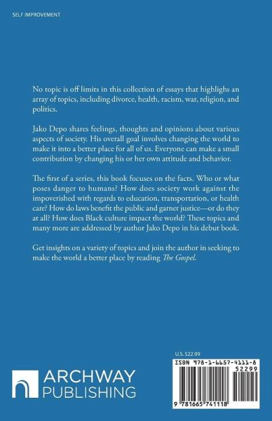 No topic is off limits in this collection of essays that highlighs an array of topics, including divorce, health, racism, war, religion, and politics. Jako Depo shares feelings, thoughts and opinions about various aspects of society. His overall goal involves changing the world to make it into a better place for all of us. Everyone can make a small contribution by changing his or her own attitude and behavior. The first of a series, this book focuses on the facts. Who or what poses danger to humans? How does society work against the impoverished with regards to education, transportation, or health care? How do laws benefit the public and garner justice-or do they at all? How does Black culture impact the world? These topics and many more are addressed by author Jako Depo in his debut book. Get insights on a variety of topics and join the author in seeking to make the world a better place by reading The Gospel.