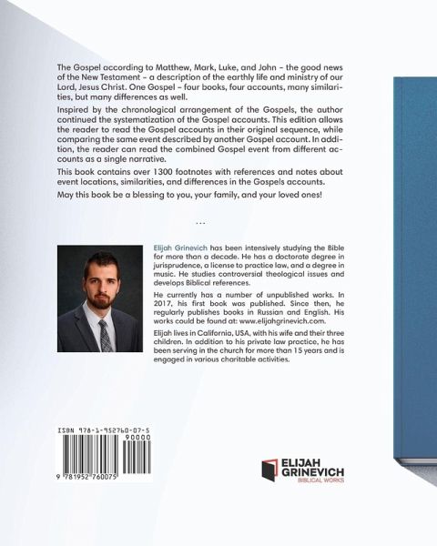 The Gospel according to Matthew, Mark, Luke, and John - the good news of the New Testament - a description of the earthly life and ministry of our Lord, Jesus Christ. One Gospel - four books, four accounts, many similarities, but many differences as well.Inspired by the chronological arrangement of the Gospels, the author continued the systematization of the Gospel accounts. This edition allows the reader to read the Gospel accounts in their original sequence, while comparing the same event described by another Gospel account. In addition, the reader can read the combined Gospel event from different accounts as a single narrative.This book contains over 1300 footnotes with references and notes about event locations, similarities, and differences in the Gospels accounts.May this book be a blessing to you, your family, and your loved ones!