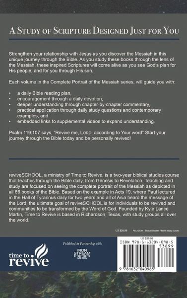 A Study of Scripture Designed Just for You Strengthen your relationship with Jesus as you discover the Messiah in this unique journey through the Bible. As you study these books through the lens of the Messiah, these inspired Scriptures will come alive as you see God's plan for His people, and for you through His son. Each volume in the Complete Portrait of the Messiah series, will guide you with:a daily Bible reading plan, encouragement through a daily devotion, deeper understanding through chapter-by-chapter commentary, practical application through daily study questions and contemporary examples, and embedded links to supplemental videos to expand understanding. Psalm 119:107 says, "Revive me, LORD, according to Your word" Start your journey through the Bible today and be personally revived! reviveSCHOOL, a ministry of Time to Revive, is a two-year biblical studies course that teaches through the Bible daily, from Genesis to Revelation. Teaching and study are focused on seeing the complete portrait of the Messiah as depicted in all 66 books of the Bible. Based on the example in Acts 19, where Paul lectured in the Hall of Tyrannus daily for two years and all of Asia heard the message of the Lord, the ultimate goal of reviveSCHOOL is for individuals to be revived and communities to be transformed by the Word of God. Founded by Kyle Lance Martin, Time to Revive is based in Richardson, Texas, with study groups all over the world.