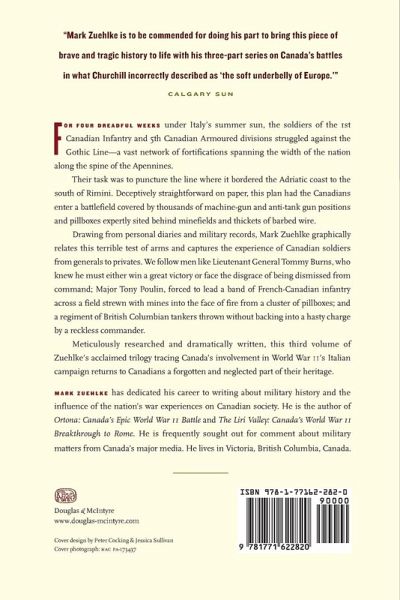 In this third volume of his critically acclaimed trilogy tracing Canada's involvement in World War II's Italian campaign, Mark Zuehlke vividly recounts the Battle of the Gothic Line. The line was meant to be impregnable, a final fortified position that would enable the battered German divisions to bring the Allied advance up Italy's boot to a decisive halt. On August 25, 1944, it fell to the soldiers of I Canadian Corps to spearhead the British Eighth Army's attempt to rip a hole in the line. For the next twenty-eight days, the men of 1st Canadian Infantry Division and 5th Canadian Armoured Division slugged their way through a rugged killing ground in the most costly battle of the campaign. The Gothic Line portrays the horror, the fear, the courage, and ultimately the glory that Canadians won on this remote battlefield.