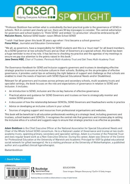 1. An Introduction to SEND and Inclusion 2. Effective SEND Governance 3. Reviewing SEND Governance and SEND Provision 4. The SENCO, the Headteacher and the SEND Governor 5. Using data strategically to develop SEND provision and evaluate effectiveness Appendix 1: Practical resources and useful organisations. Appendix 2: Summary of the 50 key messages. Appendix 3: Glossary of acronyms